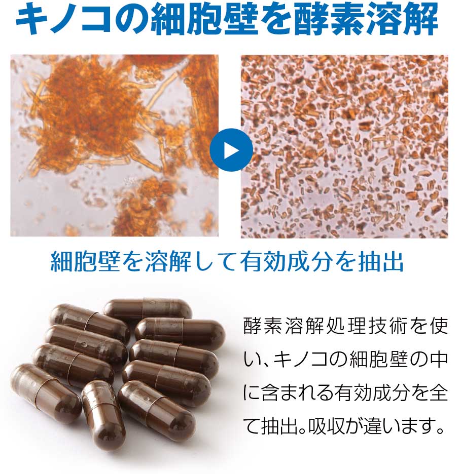 キノコ類は細胞壁と呼ばれる体を守るための鎧を持っています。その鎧はカニやエビなどの甲殻類の表皮と同じキチンやグルカンと呼ばれる多糖類で出来ています。カニやエビの殻はとても硬いですが、実はキノコも同じ殻を持っているのです。ですからそのままでは中の有効成分を摂取することは困難です。ところがひとたびこの殻(細胞壁)を溶解してしまうと、裸の細胞になり、中の有効成分が人の体に吸収しやすくなるのです。PIVOT JAPANの「酵素処理チャーガ」は溶菌酵素を使いチャーガの頑強な細胞壁を溶かす処理を行っているので、裸の細胞になり、チャーガの成分が人の体に吸収されやすくなります。