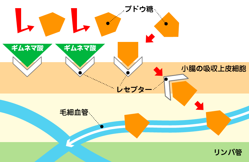 小腸での糖の吸収を表わしたのが下の図です。この図からもわかるようにギムネマ酸は糖が吸収されるレセプターをふさいでしまうのです。
